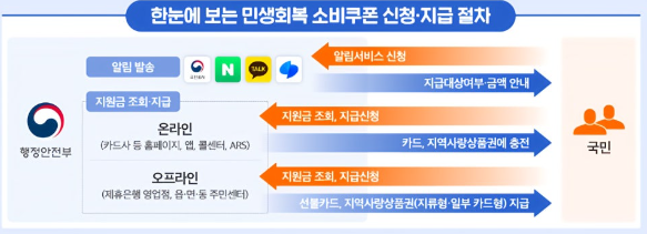 온라인은 카드사, 지역사랑상품권 앱 및 홈페이지, ARS 등으로 가능하고, 오프라인은 읍면동 주민센터나 복지센터에서 신청 가능하다. 신청은 본인이 직접 해야 하며, 세대주나 타인이 대리 신청하거나 중복 수령하는 것은 불가능하다.