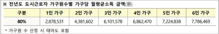 2024년 도시근로자 가구당 월평균 소득 기준 (130% 기준):